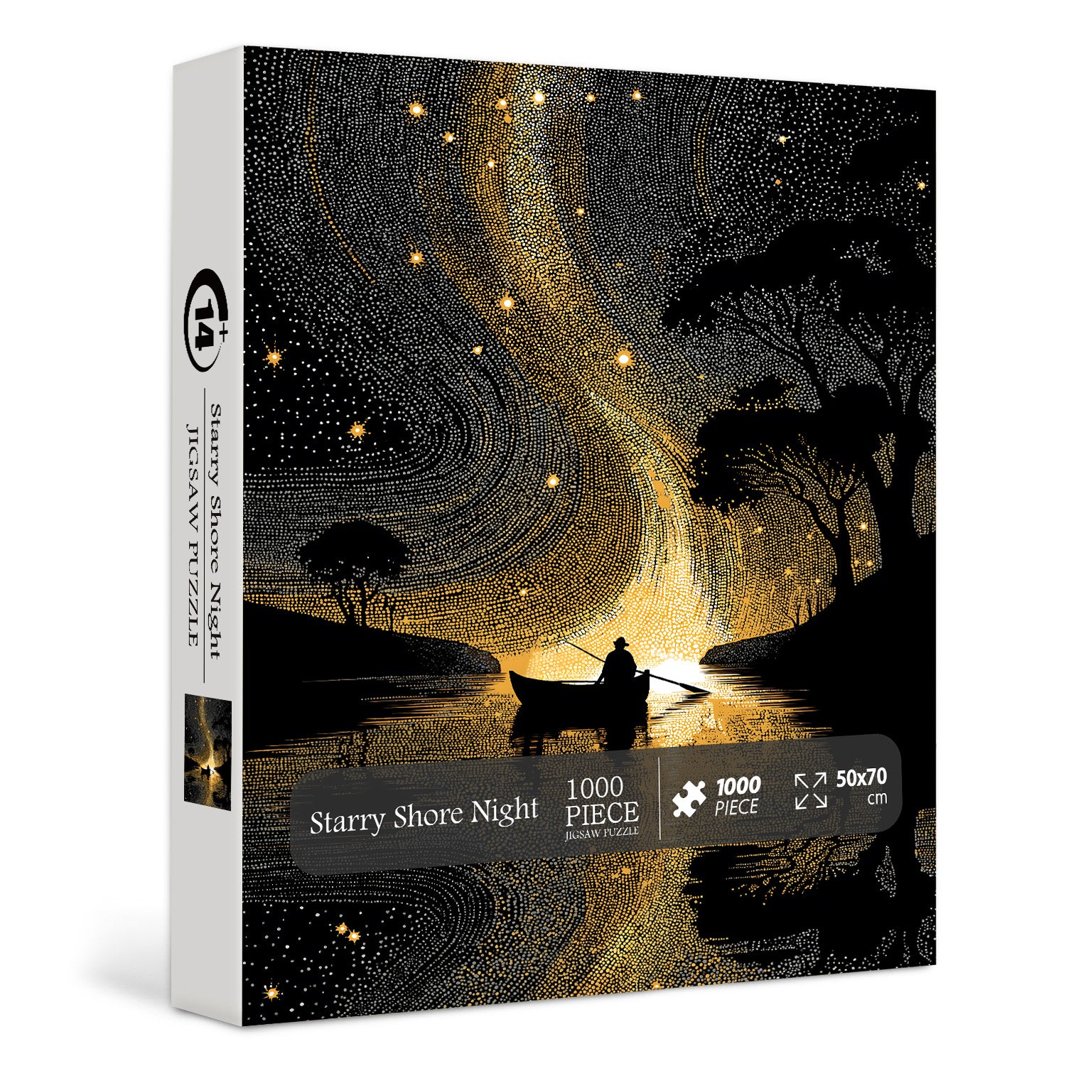 Jedes StĂŒck ist aus hochwertigem recyceltem Karton mit samtig-matter OberflĂ€che gefertigt und sorgt so fĂŒr eine nahtlose Passform und eine OberflĂ€che, die die satten Töne der Nacht intensiviert, ohne zu blenden. Mithilfe fortschrittlicher Drucktechniken und lichtbestĂ€ndiger Tinten erfassen wir den subtilen Farbverlauf des DĂ€mmerungshimmels, das komplizierte Funkeln jedes einzelnen goldenen Sterns, die glatte Silhouette des Bootes und die spiegelĂ€hnliche Reflexion auf dem Wasser â und bewahren so die magische AtmosphĂ€re der Szene bis ins kleinste Detail.
