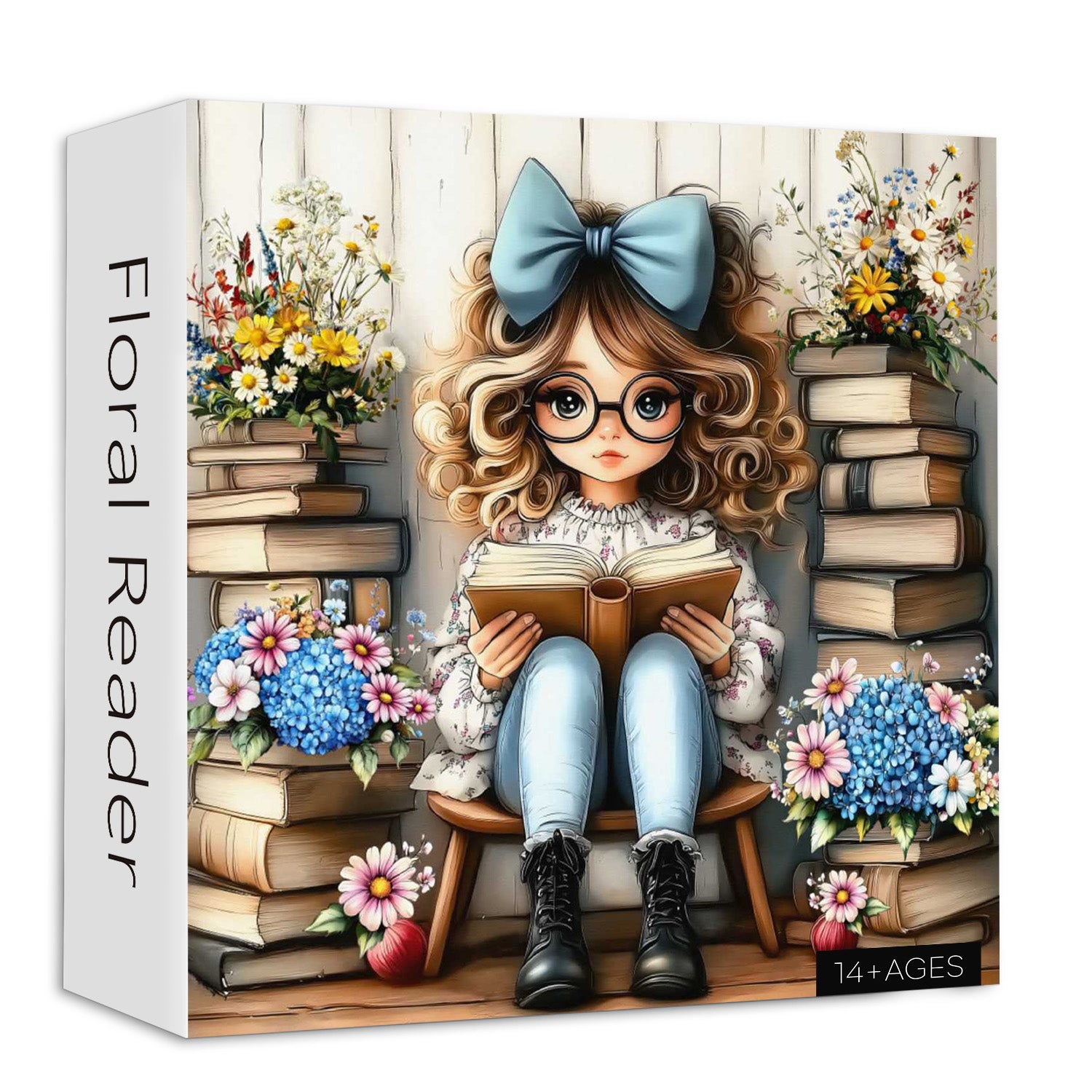 Eine skurrile Illustration eines lockigen Mädchens mit einer großen blauen Schleife und Brille, das ein Buch liest, während es von Bücherstapeln und leuchtenden Wildblumen umgeben ist, und so einen warmen, einladenden literarischen Rückzugsort schafft.