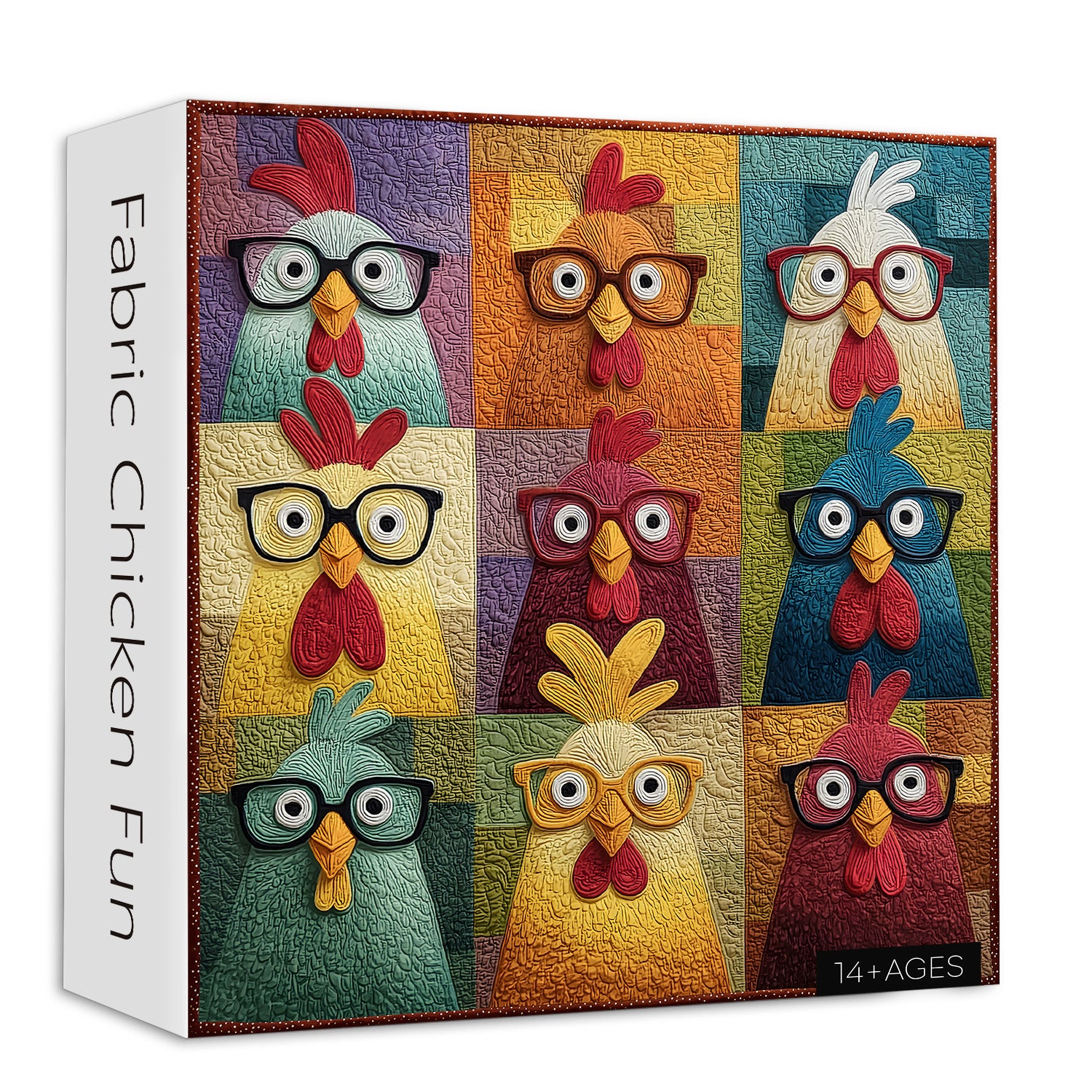 🐔👓🧵 A 3x3 grid of colorful, whimsical chicken faces, all wearing glasses, set against textured patchwork squares in this charming quilt-style artwork.