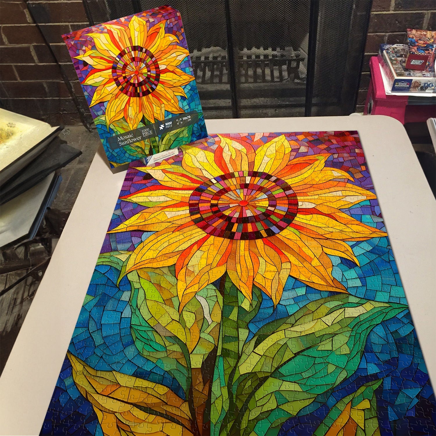 Captivating Mosaic Design:Dive into a mesmerizing world of sunflowers with our 'Mosaic Sunflower Jigsaw Puzzle 1000 Pieces'. Each piece is intricately designed to showcase the beauty and vibrancy of these iconic flowers.