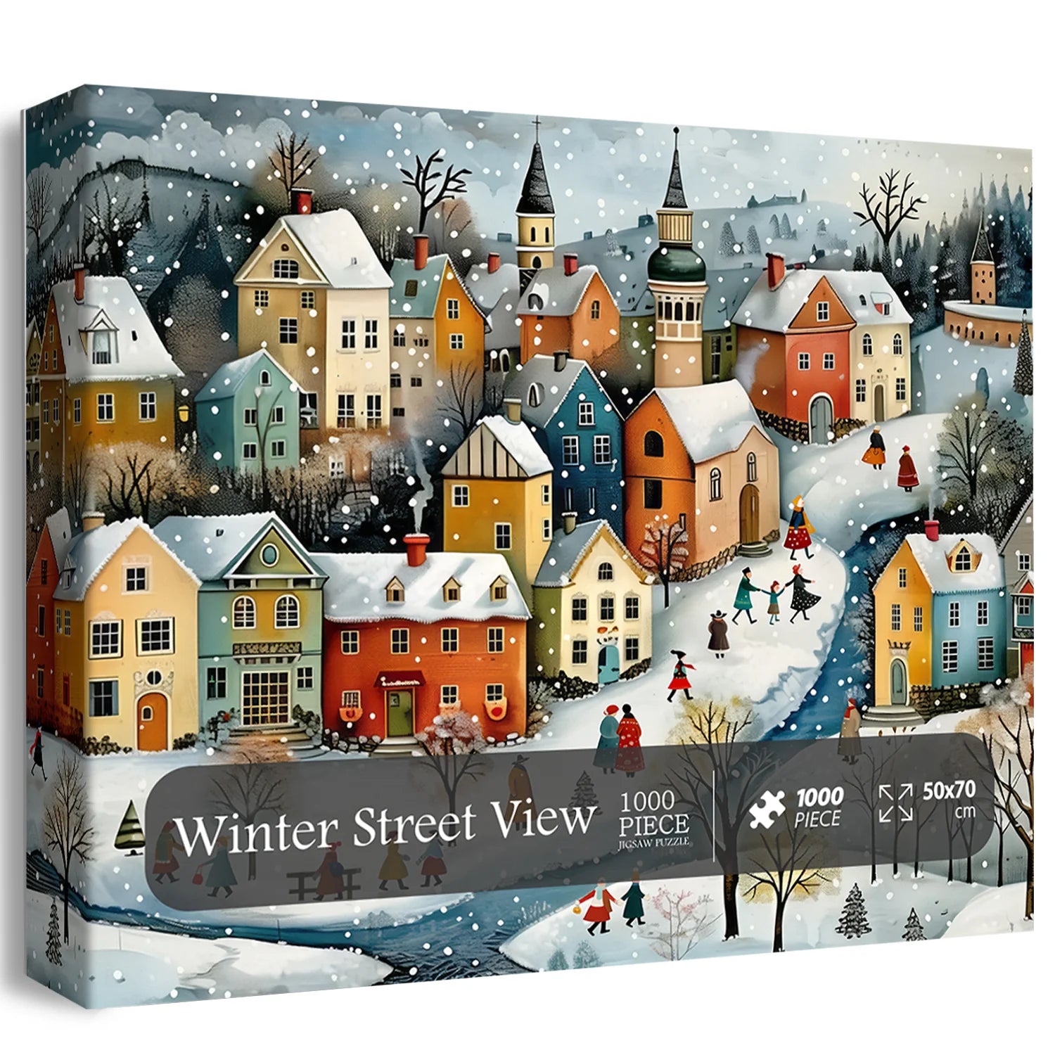Unbox a beautifully designed packaging box containing a high-definition poster for reference. Once completed, the puzzle transforms into a captivating 70 x 50 cm artwork, ready to adorn your space with the peaceful allure of the Winter Street View scene.