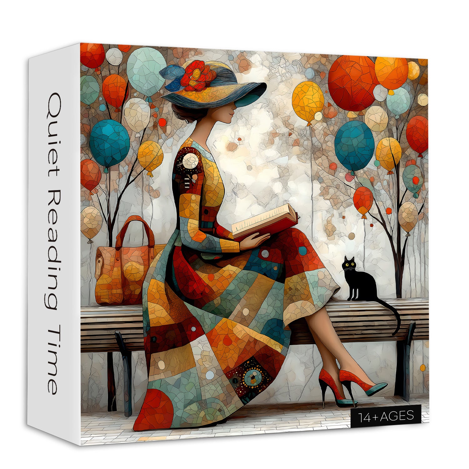 Discover a moment of perfect peace with Quiet Reading Time. This enchanting scene captures a stylish woman in a beautifully detailed mosaic-patterned dress and a wide-brimmed hat, lost in a book on a sunlit bench. By her side, a loyal black cat keeps watch, while the world around them transforms into a dreamscape of trees filled with vibrant, floating balloons. It’s a celebration of quiet joy, imaginative whimsy, and cozy, colorful charm.